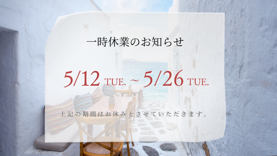 ホームサポートを受けるお知らせ 【一時休業のお知らせ】2026/05/12(火)~2026/5/26(火) 2026.04.28 SHARE ポスト シェア はてブ LINE 海外出張のため、2026年5月12日(火)から2026年5月26日(火)まで休業いたします。期間中いただいたお問合わせにつきましては、5月27日(水)以降にご連絡させていただきます。ご不便をおかけしますが、どうぞよろしくお願いいたします。 ニュースレター「Inspire Your Life」 あなたの中に、そっと風を送るようなストーリーを。心に触れる言葉と写真、五感をくすぐるアイテムやイベントのご案内が届く、2か月に一度の便りです。 Inspire Your Lifeをのぞいてみる